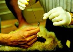 Foto que muestra la maniobra de implante de Semillas de Oro en una cadera canina