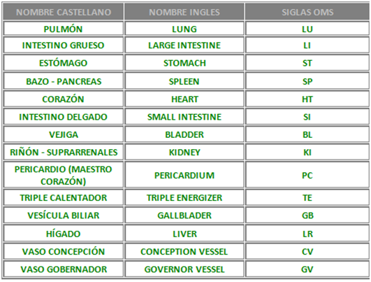 NOMENCLATURA DE MERIDIANOS DE ACUPUNTURA SEGÚN LA OMS