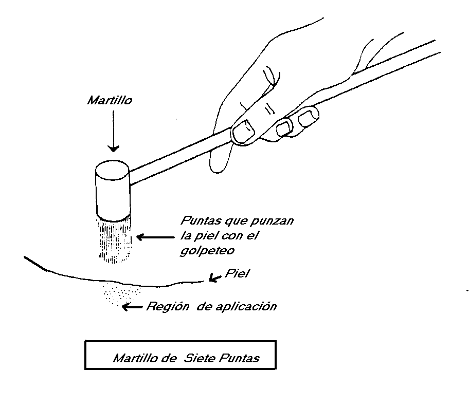 En la siguiente figura, se muestra un martillo de siete puntas y su forma de aplicación sobre la superficie dérmica.